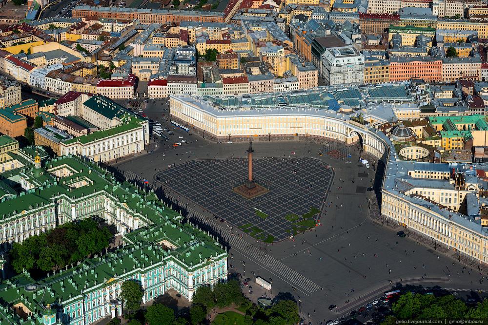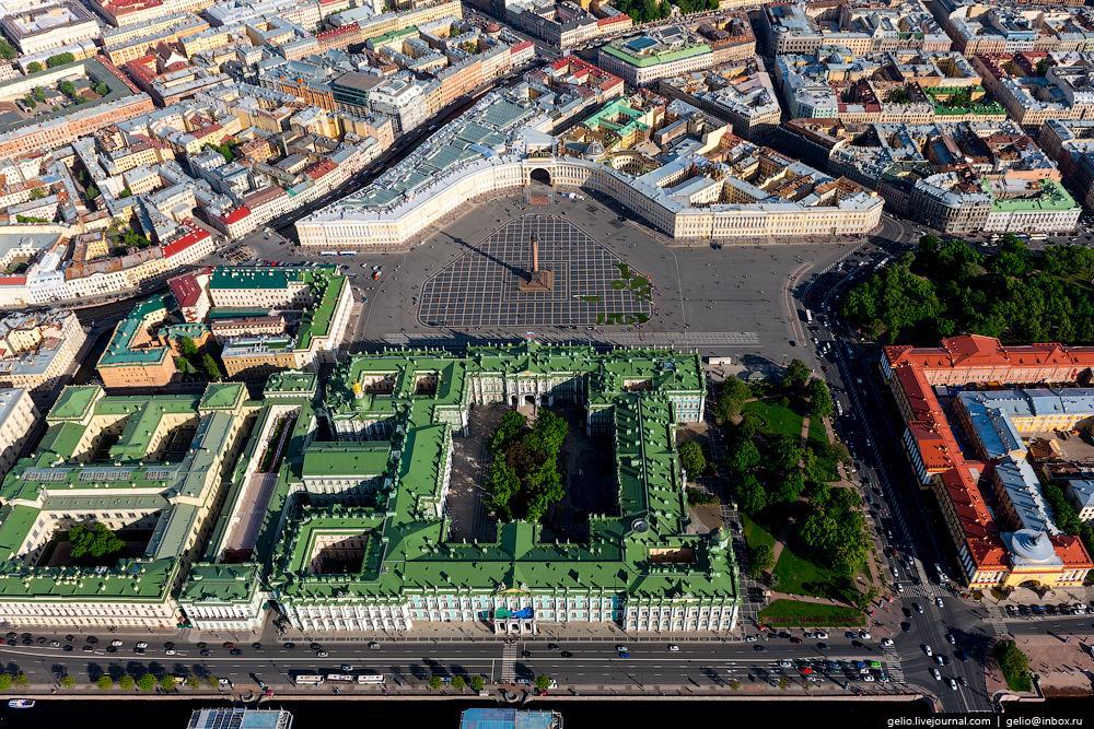 1. В центре снимка - Дворцовая площадь с Александрийским столпом. Кусок красных крыш в углу справа - Адмиралтейство, Зеленые крыши - эрмитаж. Слева вверху - зелень - Летний сад и Марсово поле.