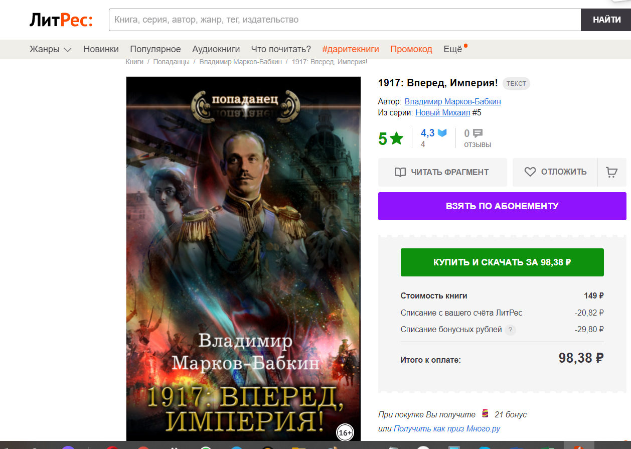 На сайте ЛитРес появился роман "1917: Вперед, Империя!". Цена - 149 рублей. На целый рубль дешевле, чем на АТ! (шутка). А если серьезно, то личная просьба ко всем - оставьте свои отзывы и комментарии к книге. Заранее благодарю!