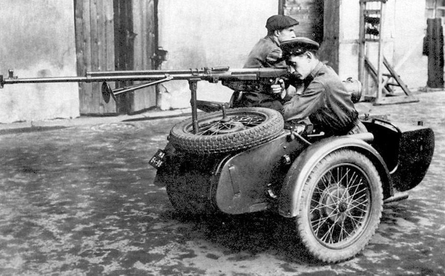 Разумеется пулемётами и автоматами дело не ограничивалось. Огневую мощь мотоциклистов всё время пытались повысить. Вот здесь на него установили противотанковое ружьё Дегтярёва ПТРД:
