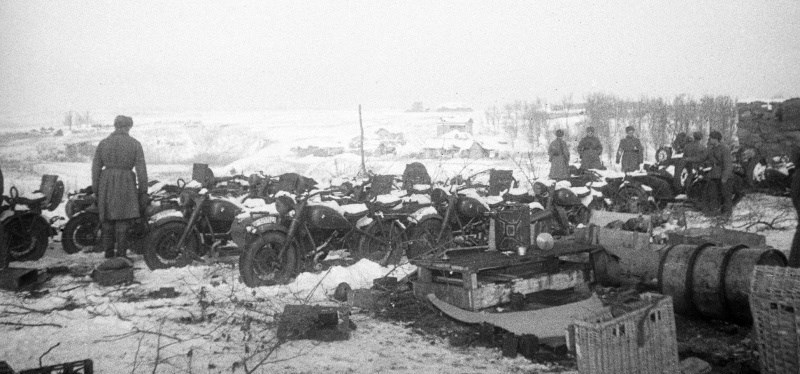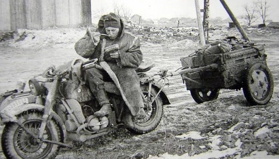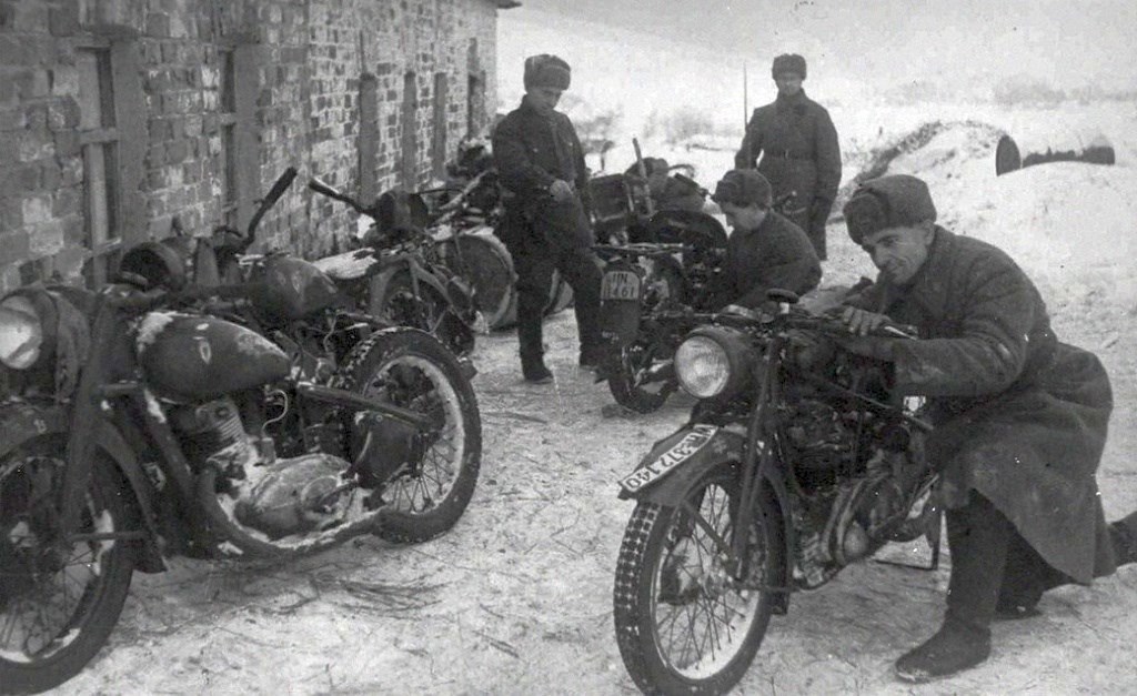 Разумеется зимой всем было холодно. Немцы пытались решить эту проблему проведя специальные воздуховоды от системы газовыхлопа к рукам, ногам водителя и в коляску. Деды говорили, что не очень много толку было от этой новации. Может быть поэтому я что-то не слышал о подобных опытах у нас. Откуда наши деды знали? Так ведь у нас на вооружении после Москвы, а особенно после Сталинграда немецких мотоциклов появилось достаточно много. Вот стоят товарищи офицеры - выбирают: