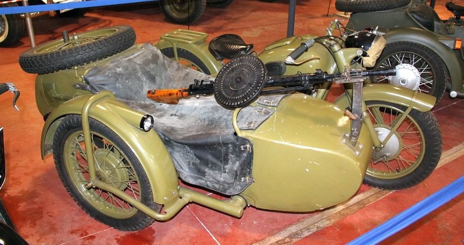 Но всё же чаще использовался с коляской. И у нас, как и у всех, тоже туда устанавливали на универсальную опору пулемёт. Чаще всего это был пулемёт Дегтярёва пехотный. Реже – его танковая разновидность. С пулемётом он выглядел вот так:
