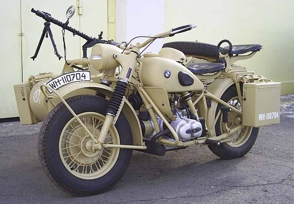 Начали создавать целый род войск. Ну и вообще удобно. Можно вывозить раненых, можно использовать для связи, можно в разведке, а можно в рейдовых операциях. И мотоциклов в Германии выпускалось немало разных. Их даже разделили на три категории: лёгкие – до 250 «кубиков», средние – до 500 и тяжёлые – свыше 500. С началом боевых действий мотоциклы у гражданского населения отняли и отдали в армию. Потом захватили Европу и там тоже мотоциклы отняли. В результате в Евробанде перед нападением на СССР мотоциклов было очень много и разных. И евробандиты использовали их для грабежей и убийства в нашей стране весьма активно. Самыми узнаваемыми из всего многообразия были мотоциклы BMW с коляской и пулемётом. Вот такие BMW R75:
