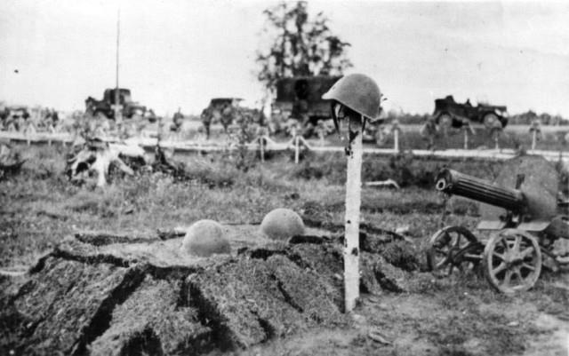 Редкий случай - немцы похоронили наших в нарушение приказа - по-человечески. Расчет пулемета "Максим"