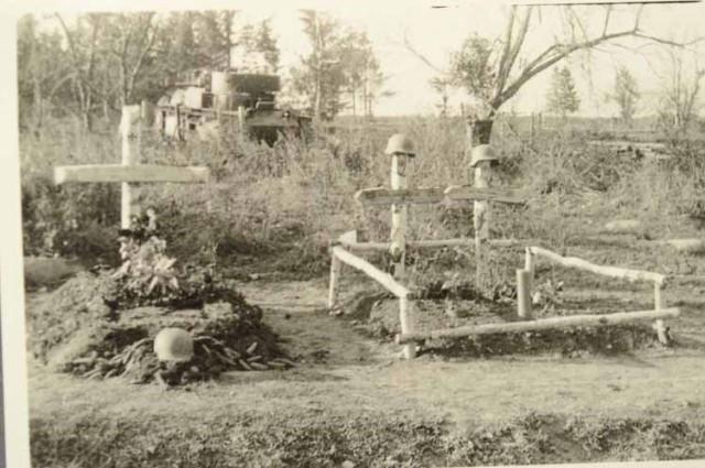 Разместил фото нашего сгоревшего КВ-1 в Стрельне. Еще фото - показывающее, что за ним немецкое кладбище. Справа аккуратные крестики.