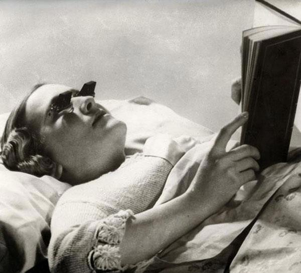Но что вы думаете? Такие очки производятся и сейчас! Ведь изобретен они были для людей, которые много времени вынуждены проводить в горизонтальном положении...