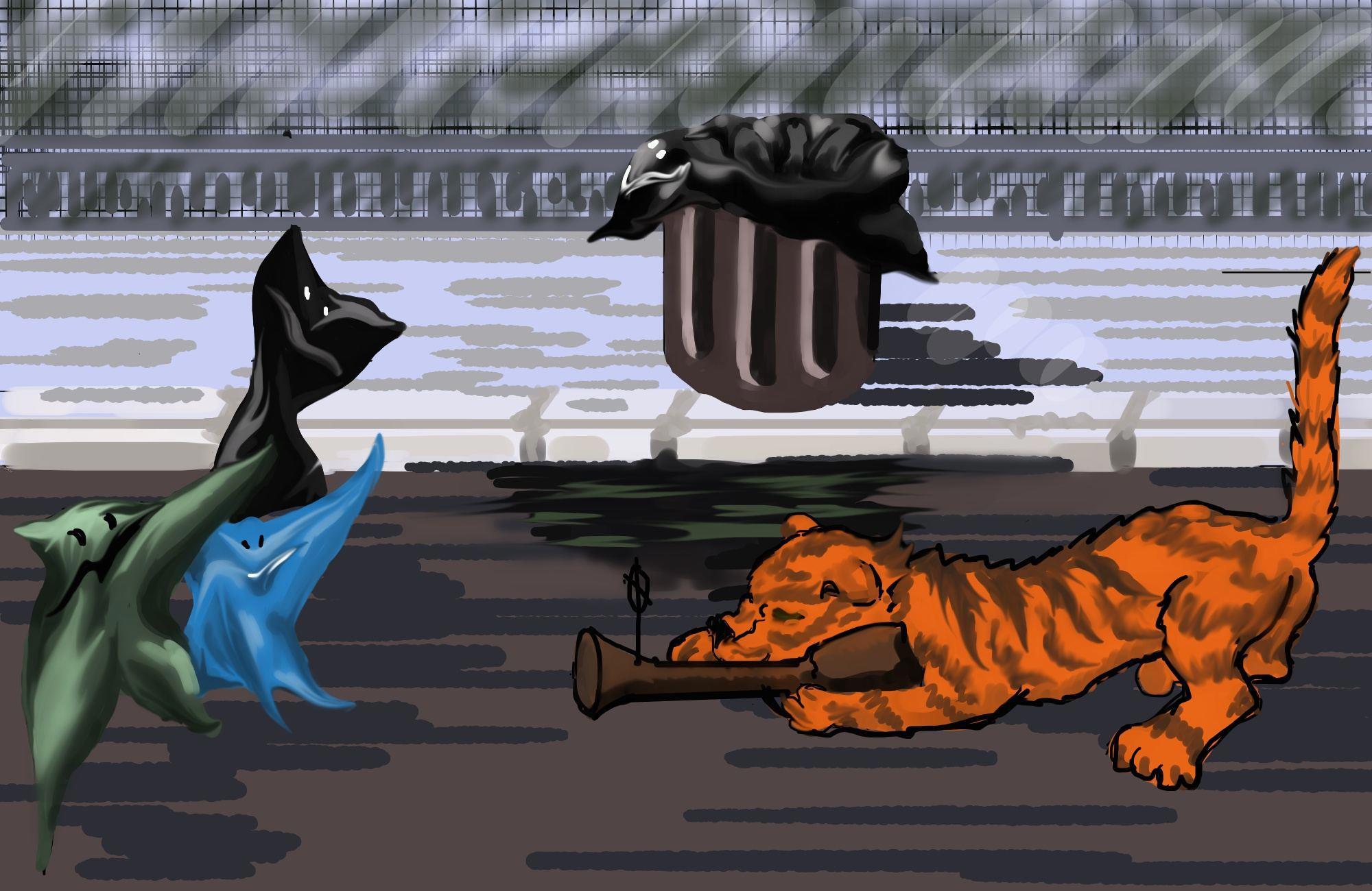 Тигруша сражается с ожившими мусорными пакетами, которые сам же и вывел в своей секретной лаборатории: