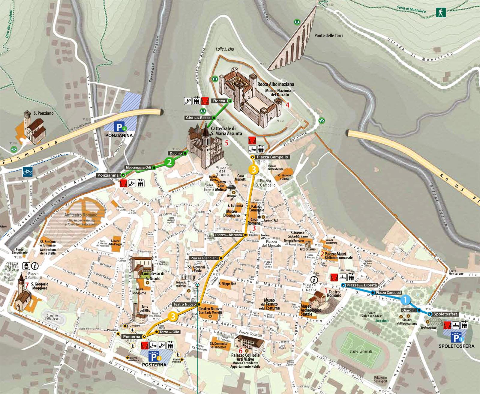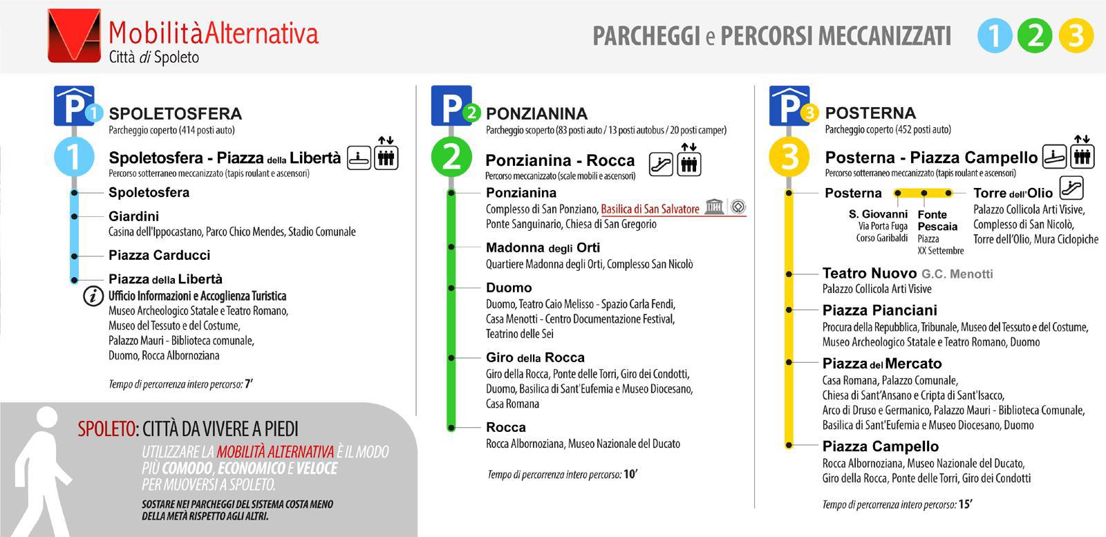 В 2007 году открылся первый тоннель от парковки у Сполетосферы до Piazza della Libertà, в котором задействованы 16 движущихся дорожек и 6 лифтов. Через 3 года к нему добавился второй маршрут, от паркинга на северном берегу ручья Тессино в нижней части города до замка, Rocca Albornoziana. Здесь под навесами на северном склоне холма Сант-Элия проходят восемь пар эскалаторов, а завершается маршрут тремя лифтами. Это позволяет менее чем за десять минут, совершенно не напрягаясь, подняться на 130 метров и наслаждаться панорамой города со смотровой площадки.