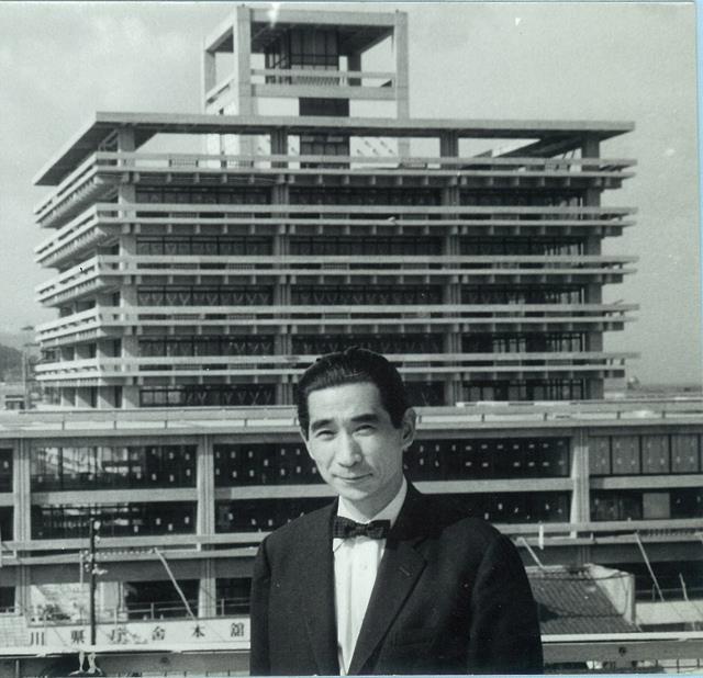 Кэндзо Тангэ на фоне здания правительства префектуры Кагава. 1958 год.