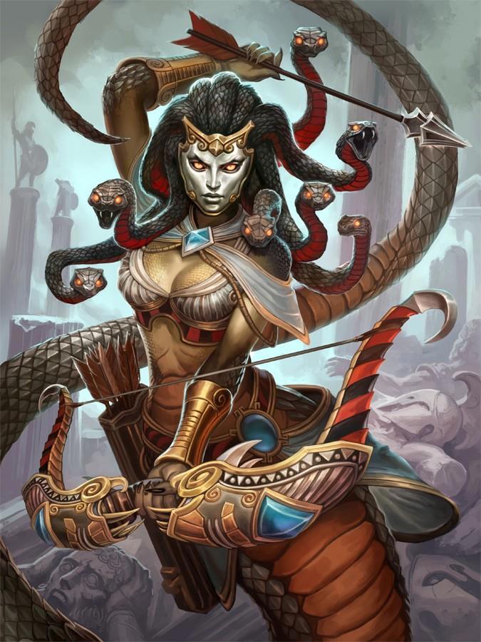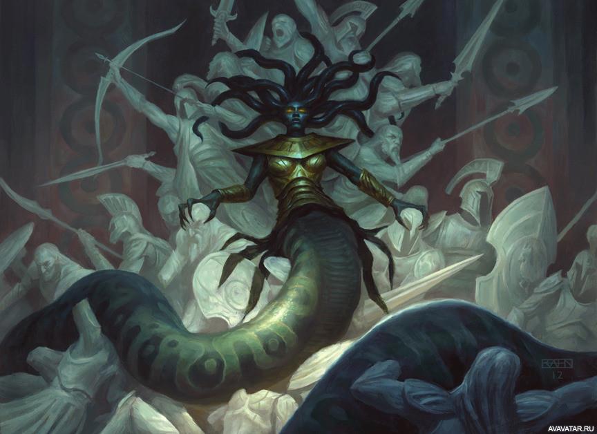 Или в образе какой-то нагини, с змеиным хвостом вместо ног. Неаутентично, но архетипично: