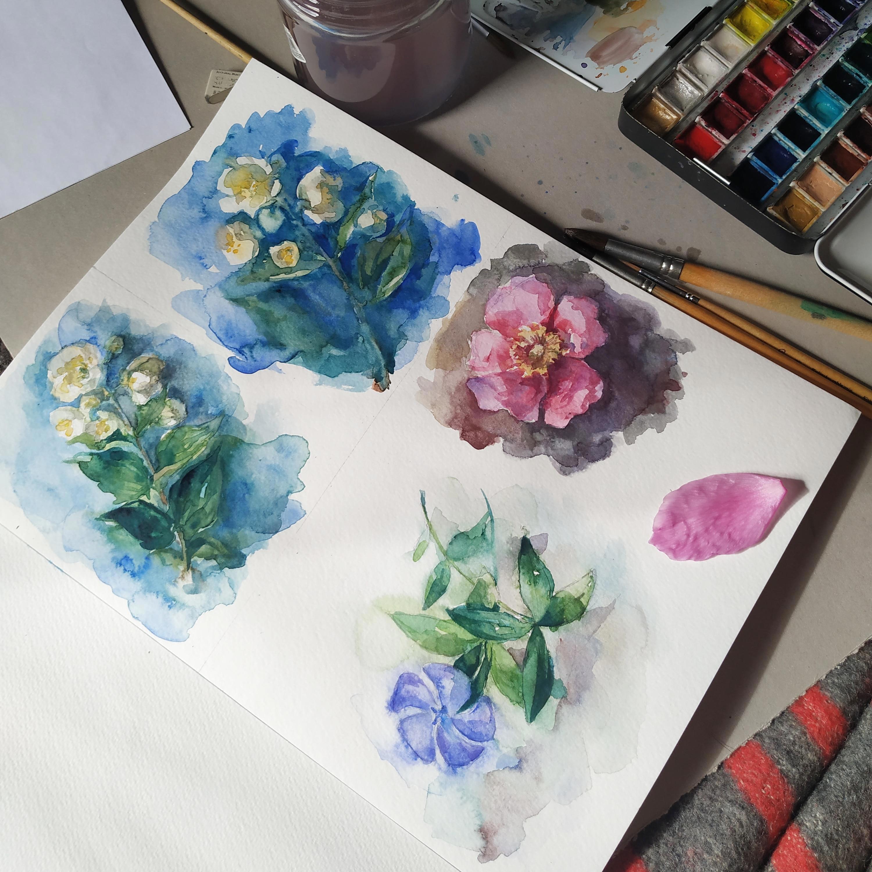 Тренировочный лист. Чубушник дважды, один с карандашным наброском, второй без. А розовый цветочек это вовсе не шиповник, а малина душистая (минутка занимательной ботаники (нет)).