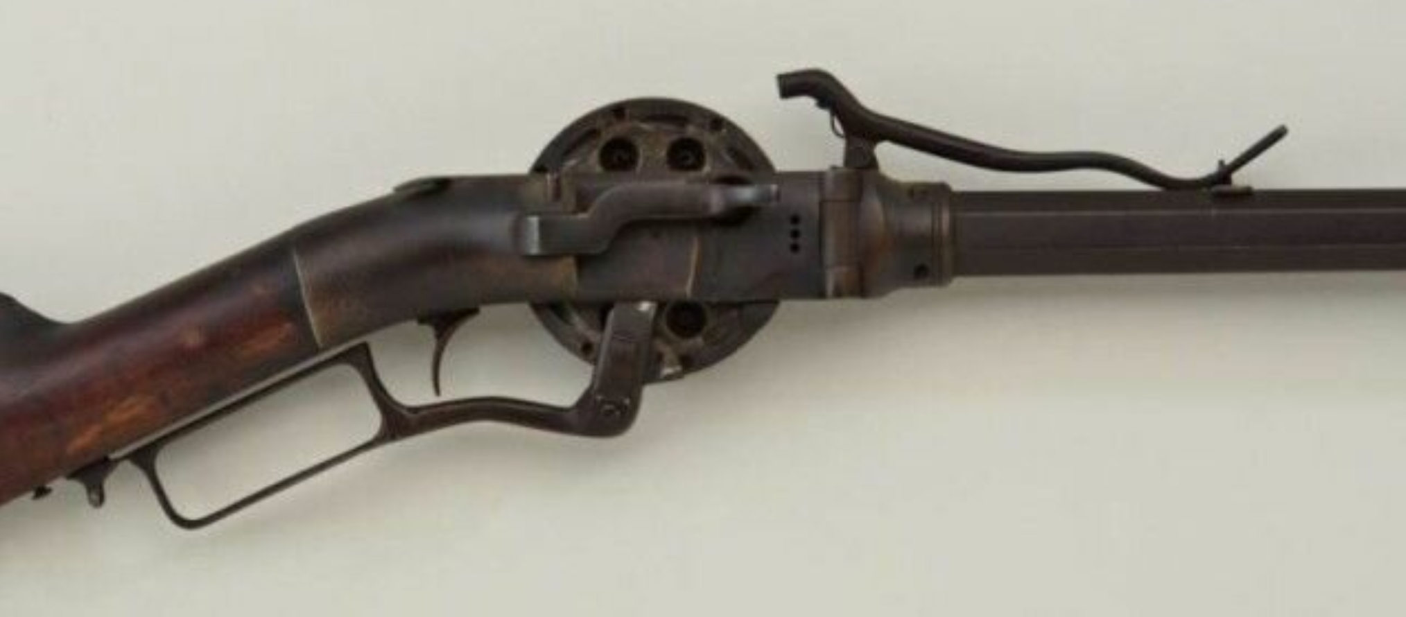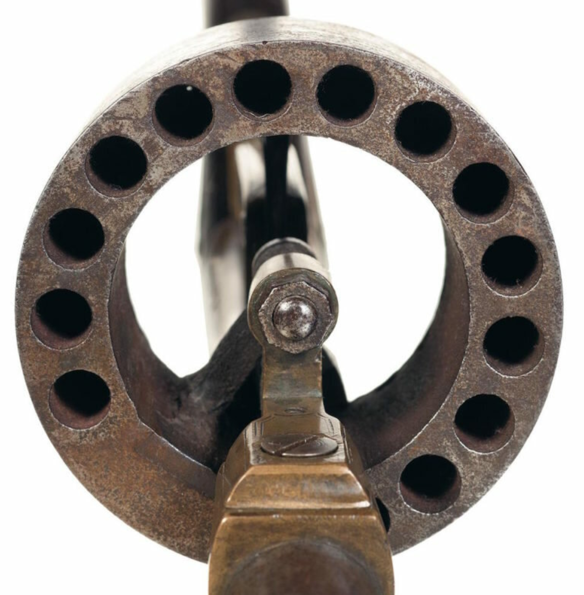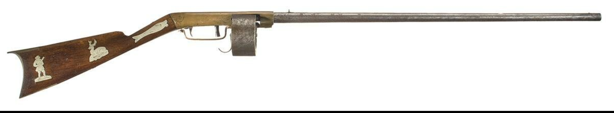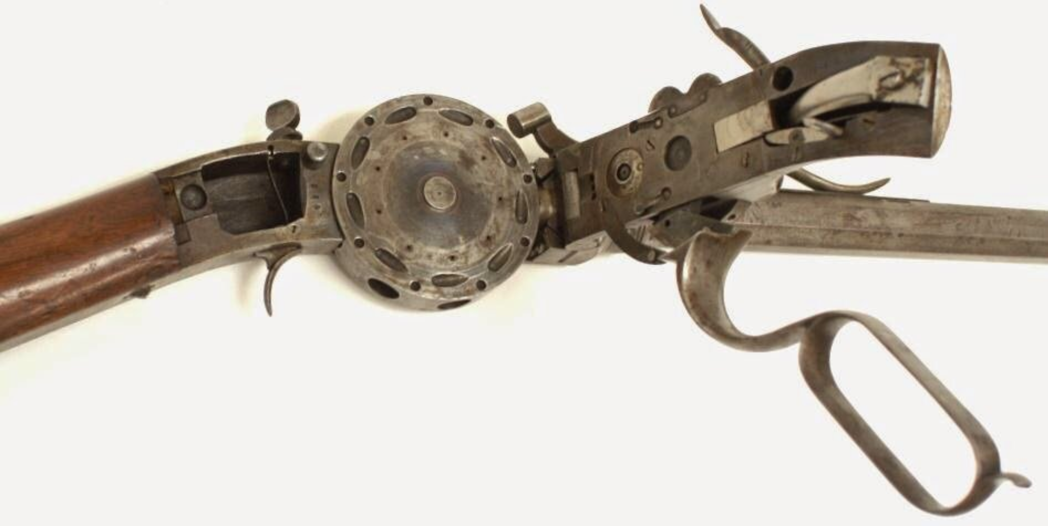 Эта винтовка родилась чуть раньше — в 1851 году. Здесь револьверную схему буквально «вывернули» — ось барабана развернули на 90 градусов, а каморы засверлили по радиусам.