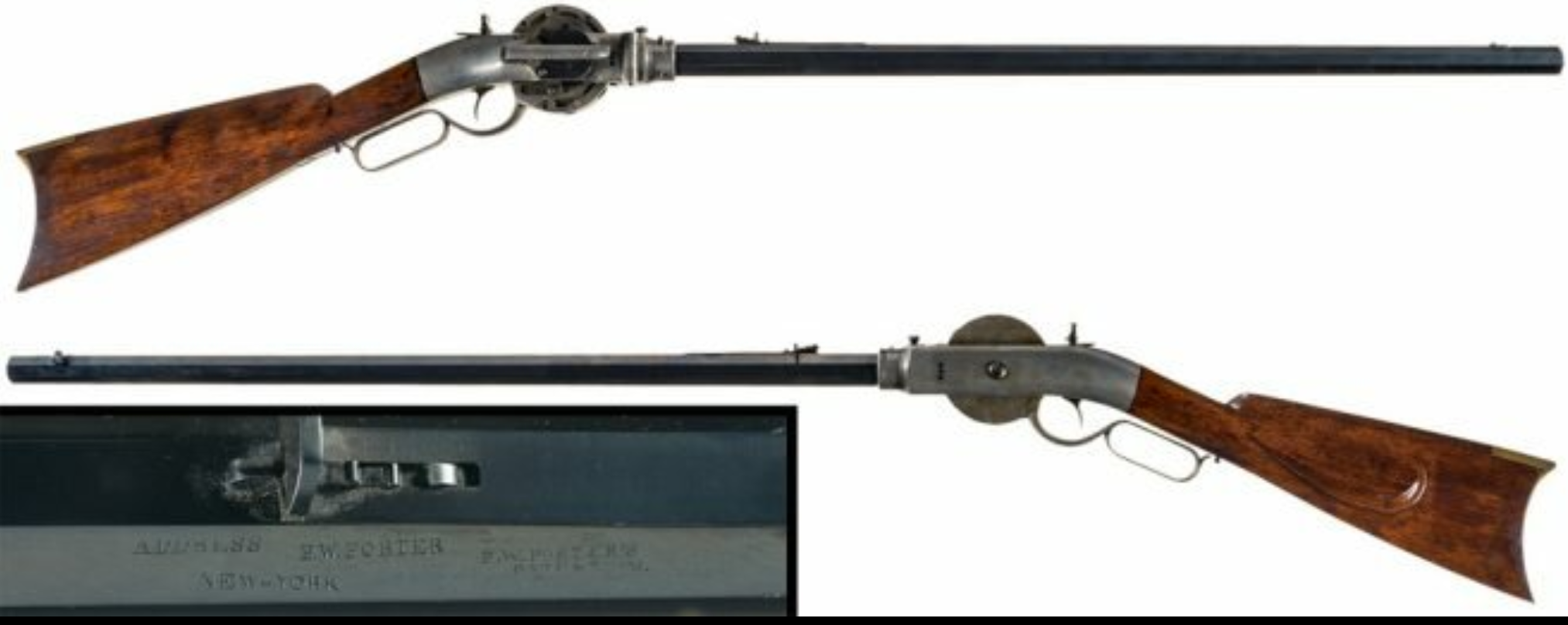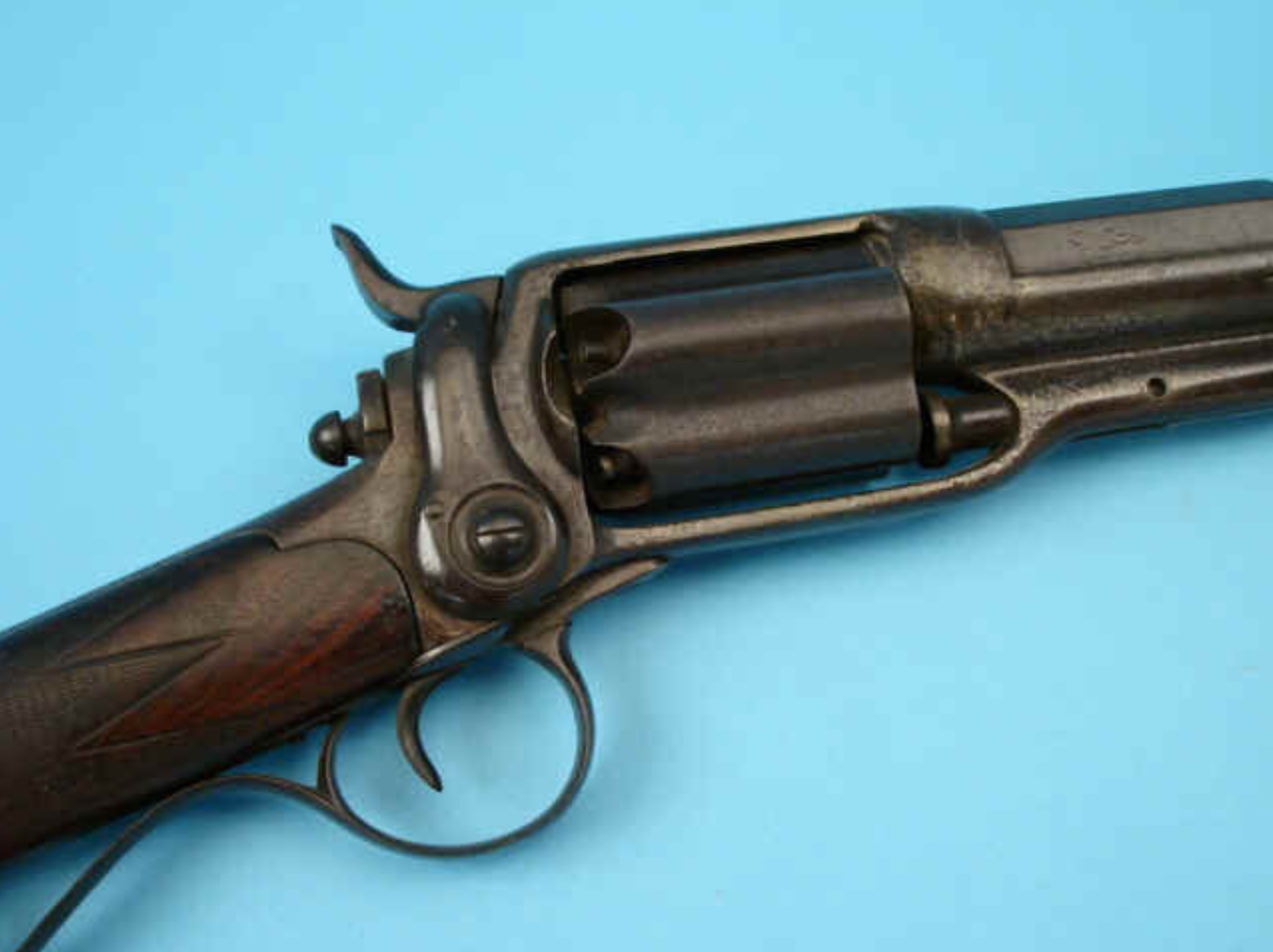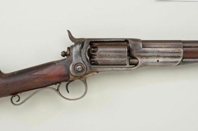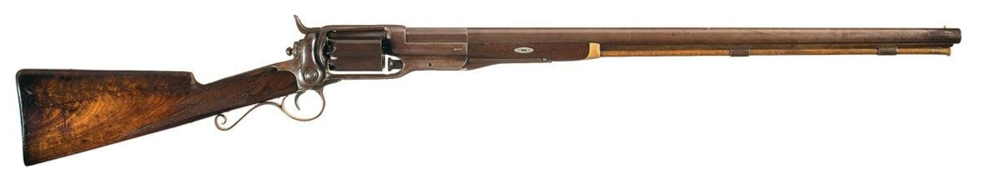 Настоящая классика — дульнозарядная (хотя применительно к револьверной схеме это и звучит не совсем правильно) винтовка с барабаном на 5 патронов и стволом 760 мм. Также выпускались и гладкоствольные версии — вплоть до 10 калибра. Изобретатель не стал придумывать что-то новое, а прилежно перенес конструктивные элементы своего же револьвера на новое ружье. Сравните сами: