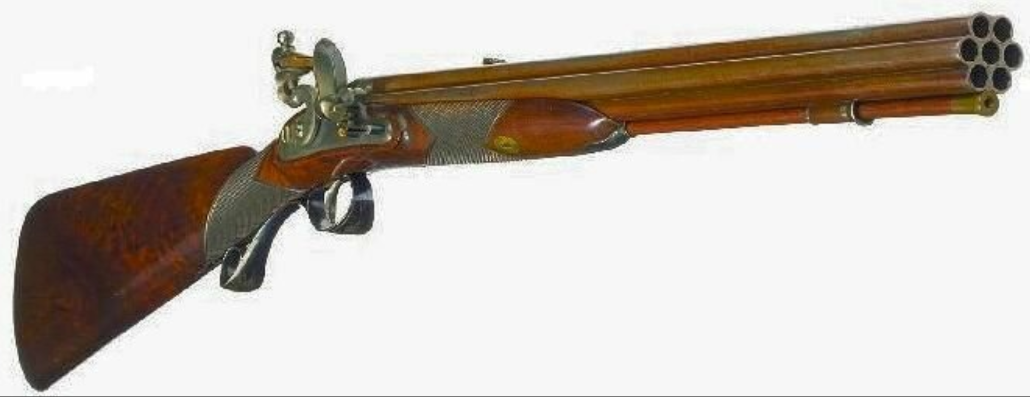 Но с длинным стволом... то есть стволами ружье бы вышло чрезмерно дорогим и тяжелым. Хотя и такие попытки предпринимались — возьмите ту же многоствольную винтовку Нока конца XVIII века.