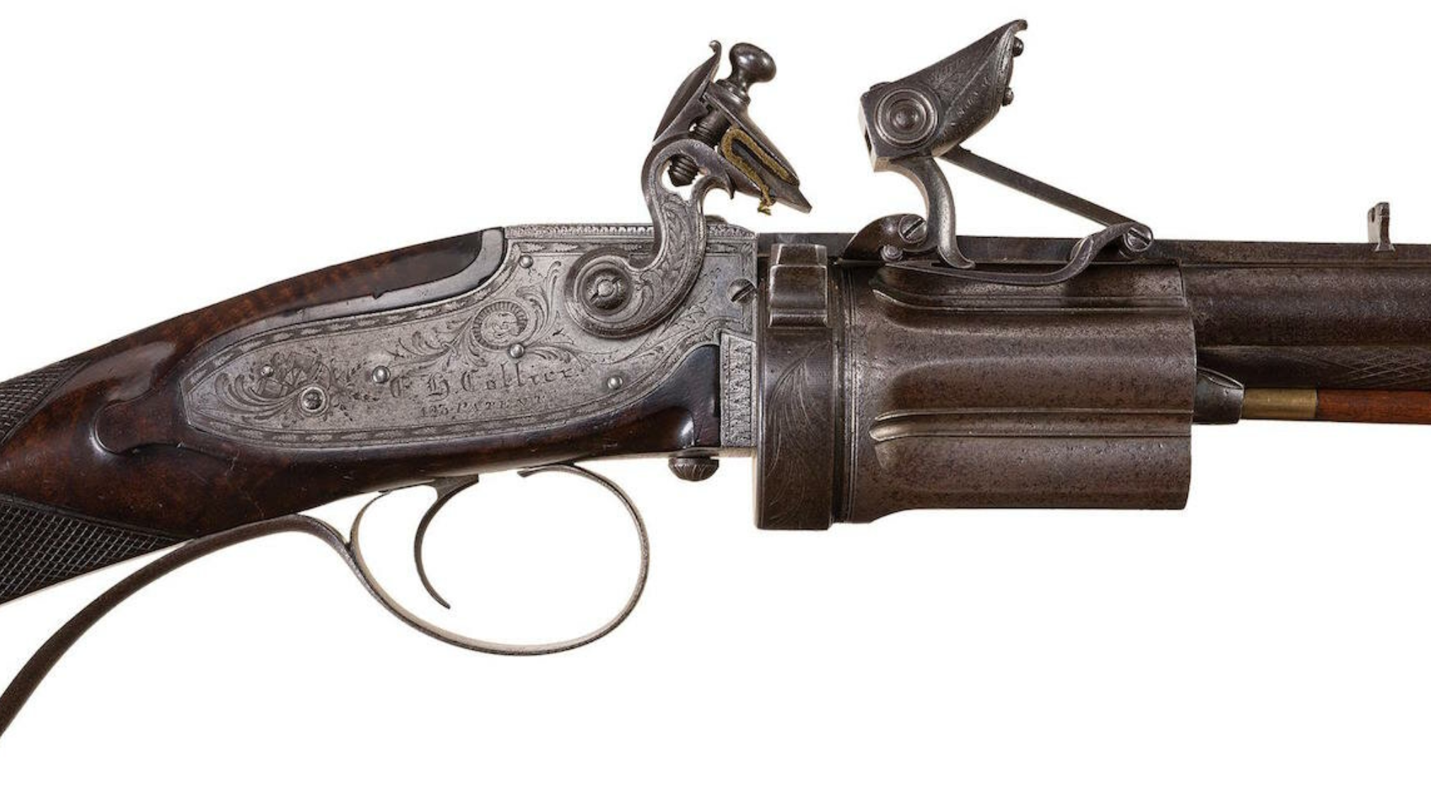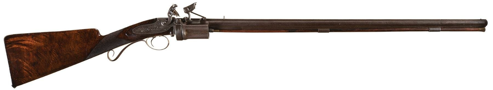 Даже в начале XIX века, когда для выстрела по-прежнему использовались искры кремневого замка, уже создавали револьверы. Пускай просто сделать несколько выстрелов подряд и было нельзя (насыпать затравку на полку приходилось вручную каждый раз), но это все равно было быстрее обычного мушкета. Работавший в Англии Элайша Коллье, переехавший в Лондон из Бостона в 1814 году, пошел дальше.