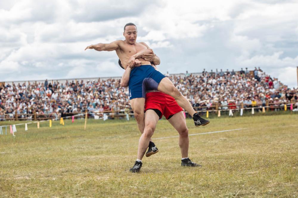 Но вот по радио разносится: «Через несколько минут начинаются поединки по борьбе «хапсагай». После этого объявления распадается круг «осуохая», стихает ансамбль. Даже у котлов с обильным угощением не остается очередей. Словно ручейки, спешат толпы людей к поляне, где будут схватки борцов.