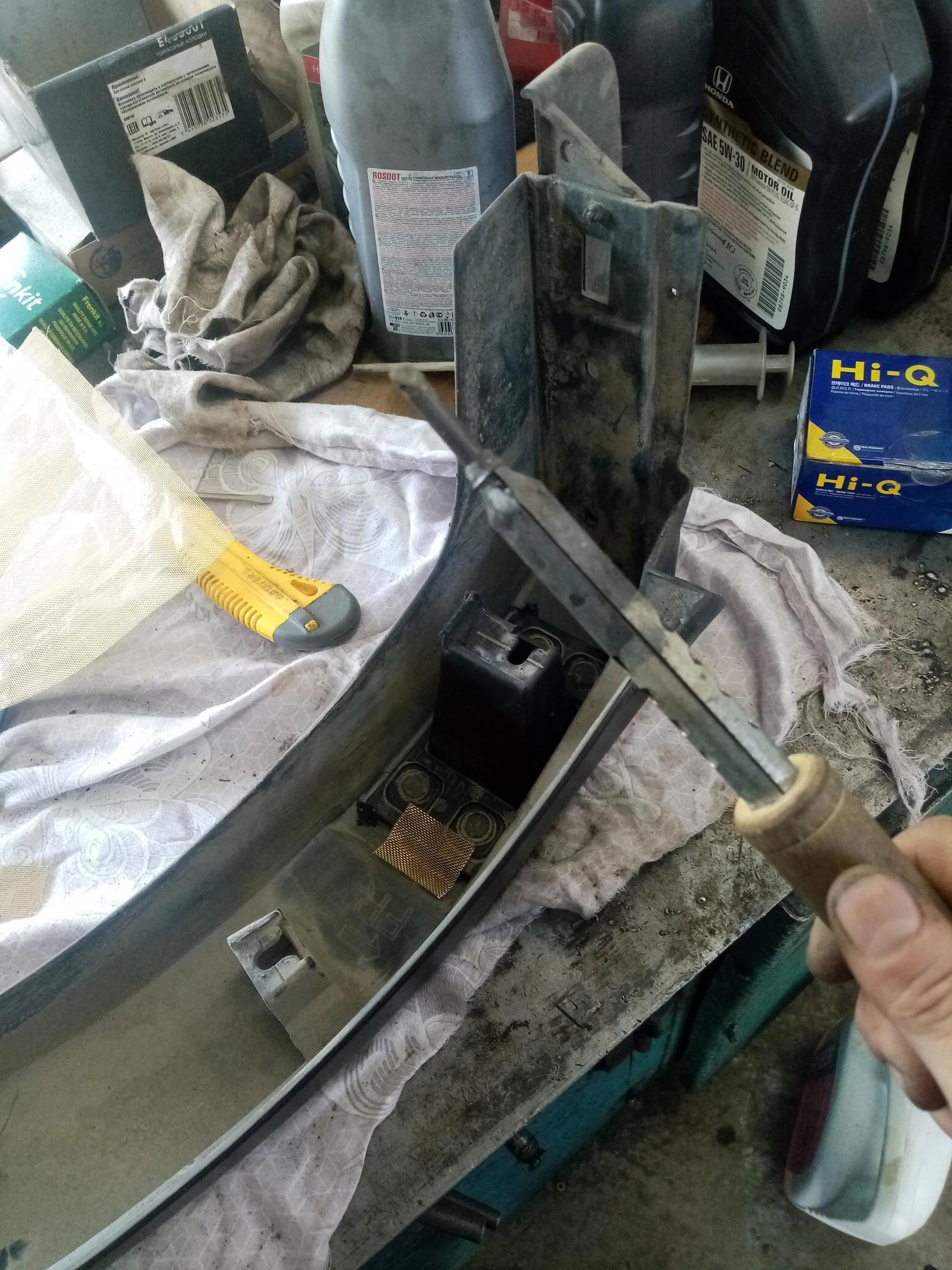 Берем сетку для ремонта пластика, паяльник, и вплавляем сетку в пластик, утапливая её после разогрева паяльником. Я утапливал шлицевой отверткой.