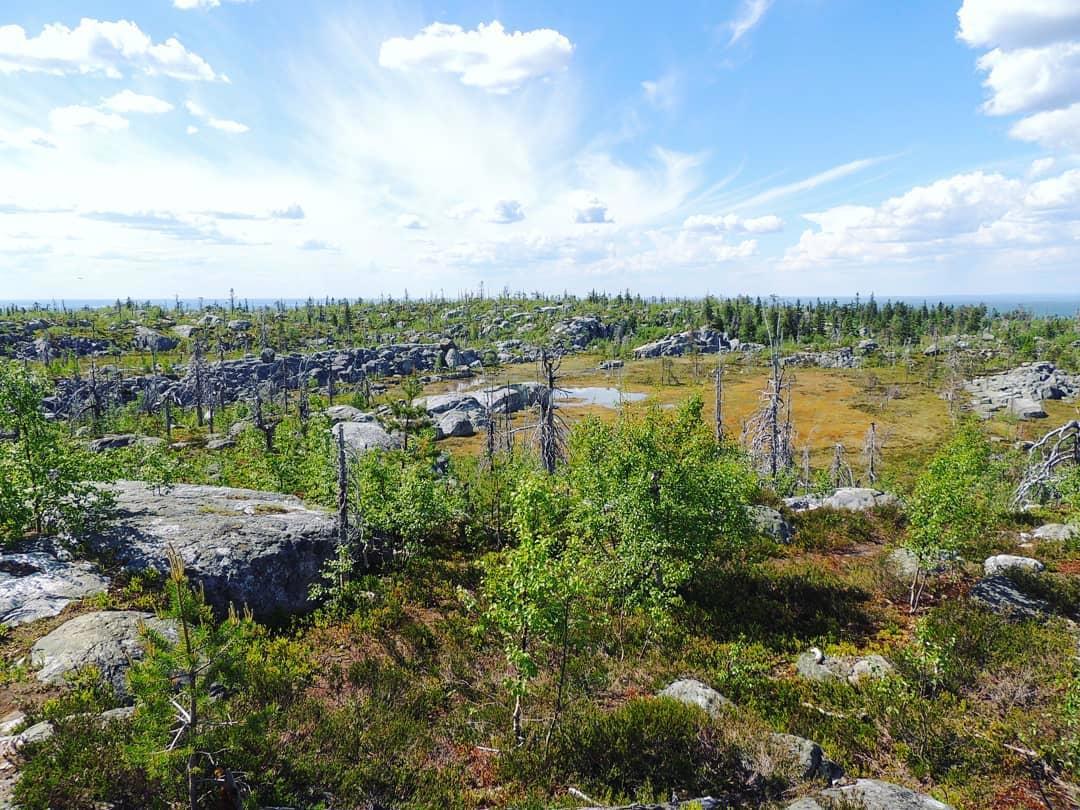 На следующий день мы вновь пересекли вершину горы с севера на юг, немного передохнули на у Родника Южной Тропы и начали спуск к подножию. Нас ждал пеший переход обратно в Гимолы и мы решили разбить его на два этапа. Большую часть пути мы прошли в этот день, включая коварные лужи-моря, которые на обратном пути преодолели уже гораздо легче. Видимо, скалолазание с тяжелыми рюкзаками на спинах пошло нам на пользу.
