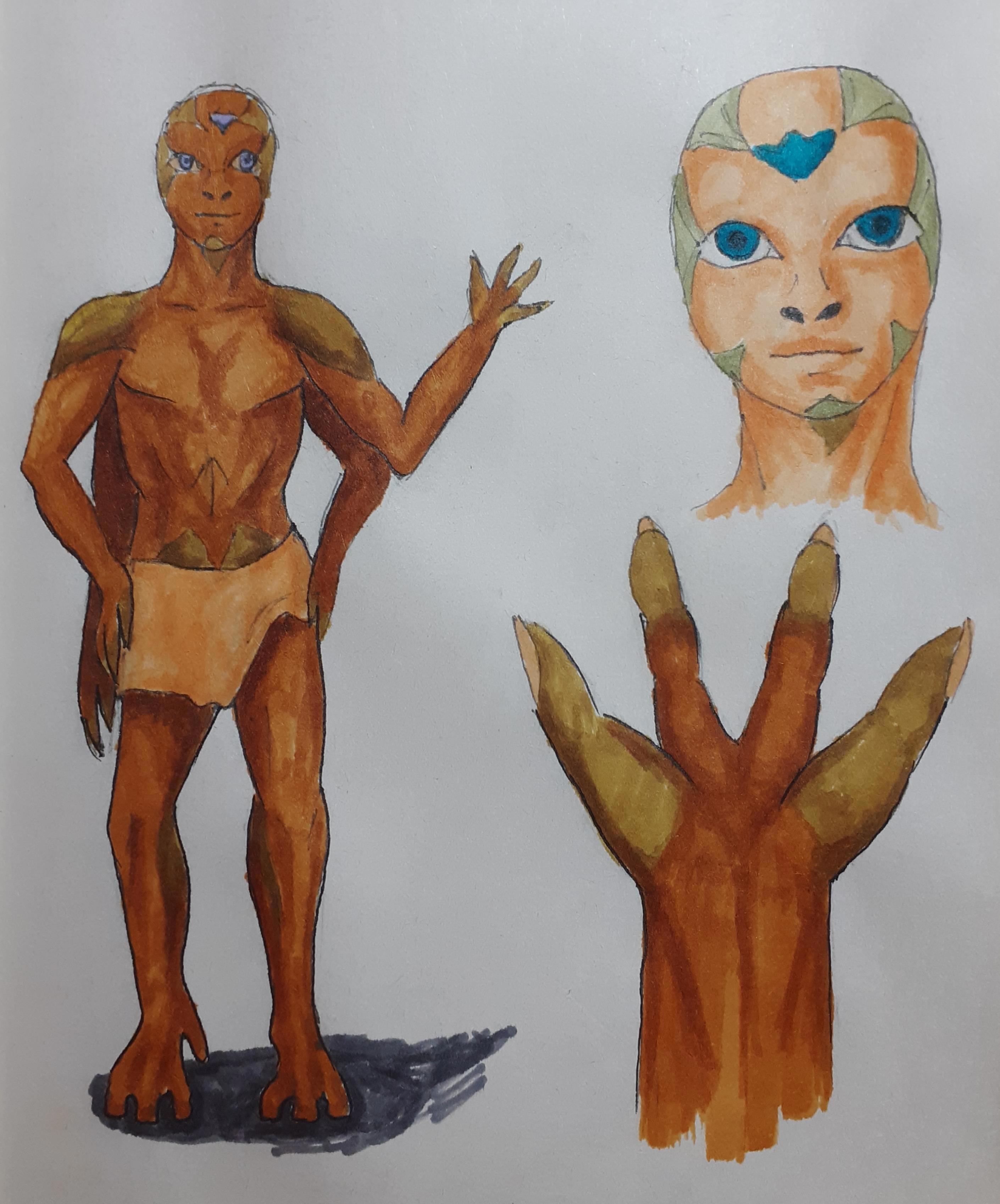 Адаптации к жизни в пустыне: широкие ноздри позволяют захватывать больше воздуха, четырехпалые ступни устроены таким образом, что кожа не обжигается при контакте с горячим песком.в глазу есть третье веко. Могут менять оттенок кожи отчасти для терморегуляции, отчасти для брачных ритуалов. Четырехруки и четырехпалы, кисть симметрична и у них два больших пальца. У них необычайно ловкие руки. На лбу есть кристаллический вырост, которые является продолжением эпифиза и дает акхари магические способности. (О магии подробнее в следующих постах) Цвет кристала на лбу уникален и совпадает с цветом глаз.