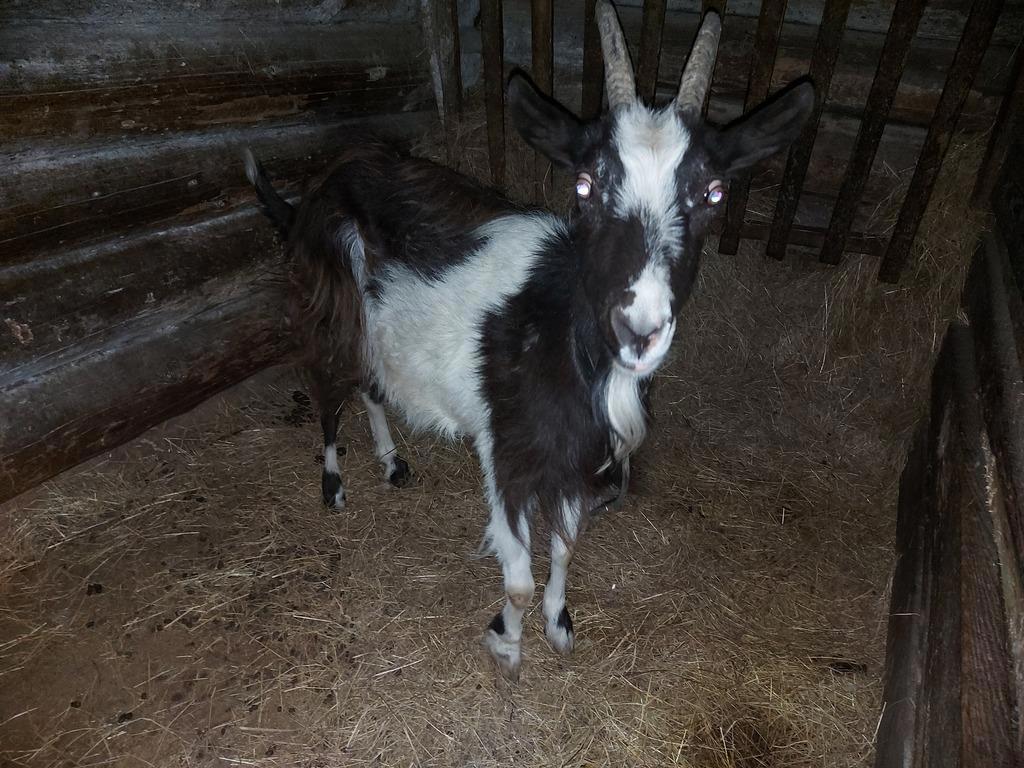 Зара, очень строгая коза. Зазеваешься - сразу прилетит рогами. Признает только хозяина.