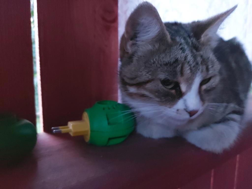 Муся после посещения коз. С другими кошками не грызется, раз рыкнет и те в рассыпную. Лучше не трогать тетю Мусю. Признает только меня, жену и сына. На остальных шипит и пытается кусануть или ударить лапой, но дает предупреждение задолго, чтобы, значит, под лапу и клык не попадались.