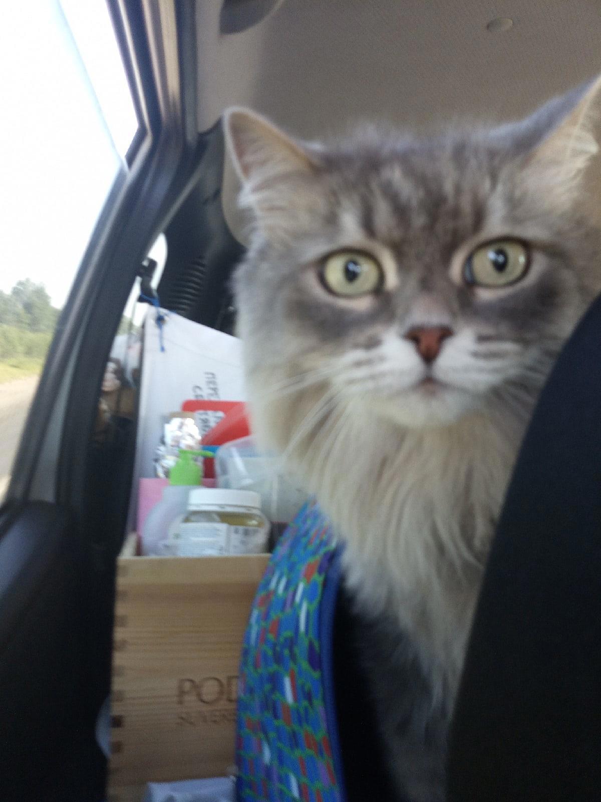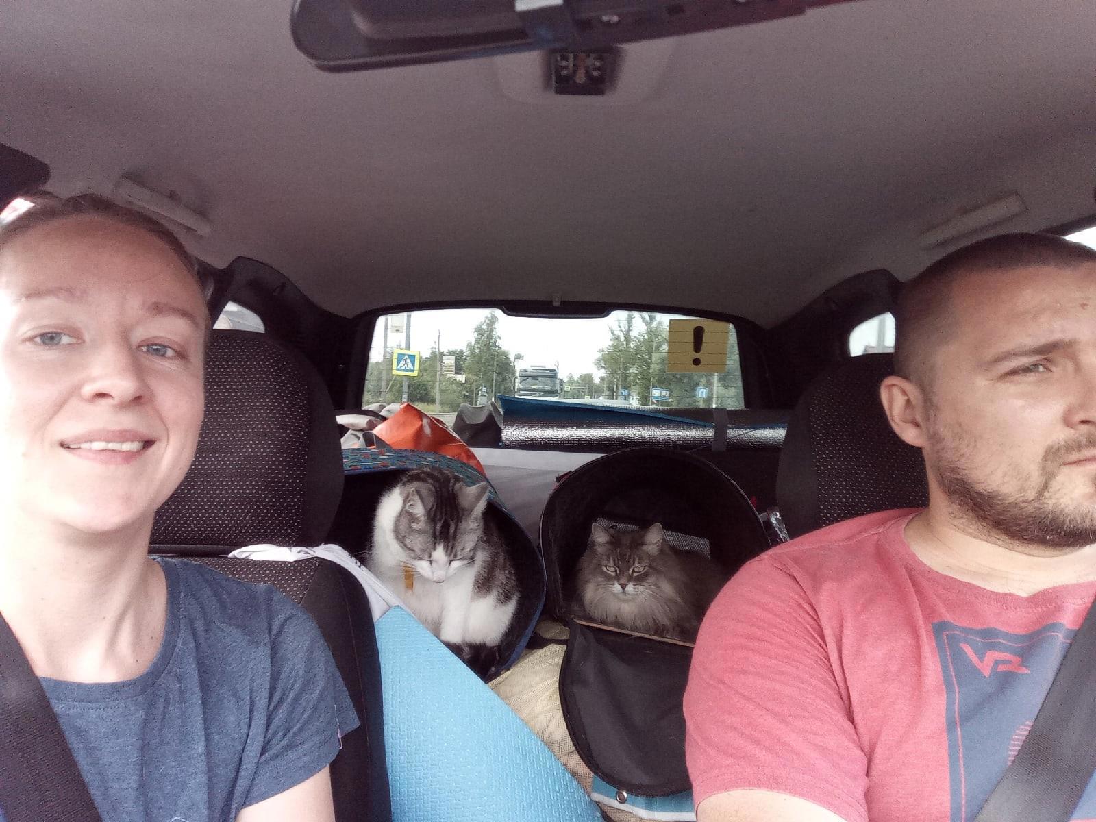 Ошарашенные внезапным путешествием кошки первое время сидели в переносках, свернувшись клубочками подальше от всего этого. Но вскоре освоились и начали пытаться получить удовольствие. Михална вообще долго ехала у заднего стекла, глядя на наши следы.