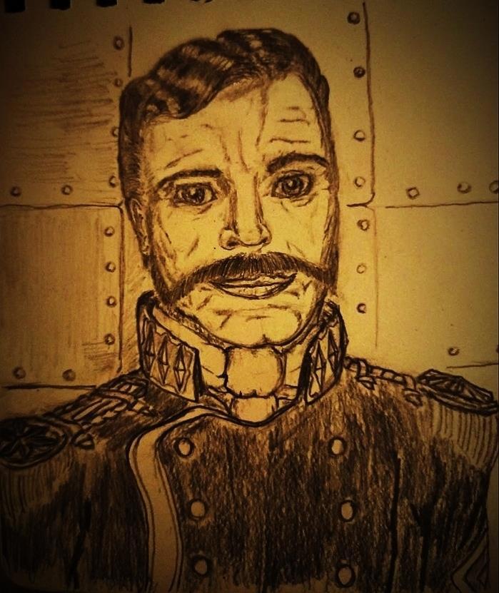 "Командир корабля, казалось, даже сейчас смотрит сквозь толпу, и стену дома с богато украшеным фасадом, готовый вырвать все богатства, спрятанные в его недрах.
