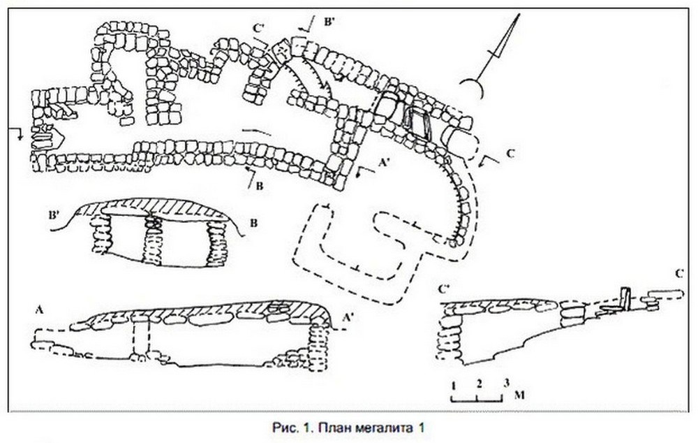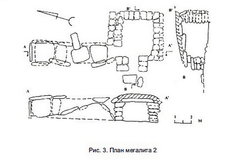 Второй мегалит находится недалеко от первого. Он значительно меньше размерами и частично разрушен ещё в древности. Вот его план, нарисованный археологами: