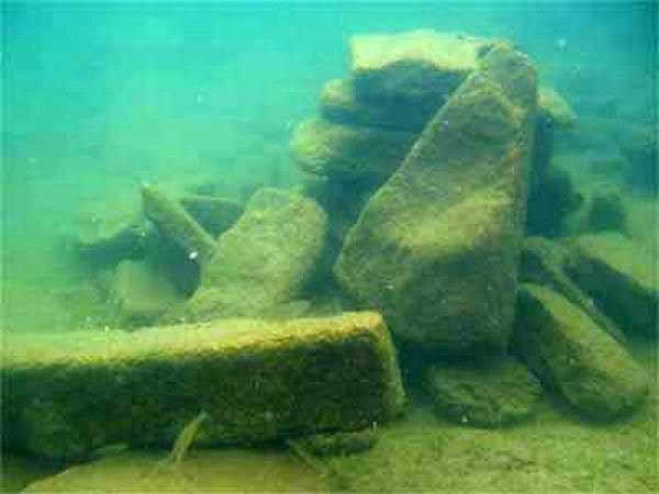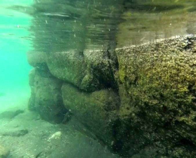 Другая часть была сфотографирована глубже… потом ещё глубже… Потом появилось убеждение, что во первые времена воды в озере было куда меньше. Разница примерно метров в пять! И значительная часть каменных загадок острова Веры находится сейчас под водой. Такие, например, как вот эти сооружения, которые сейчас условно называют «пирамидами»: