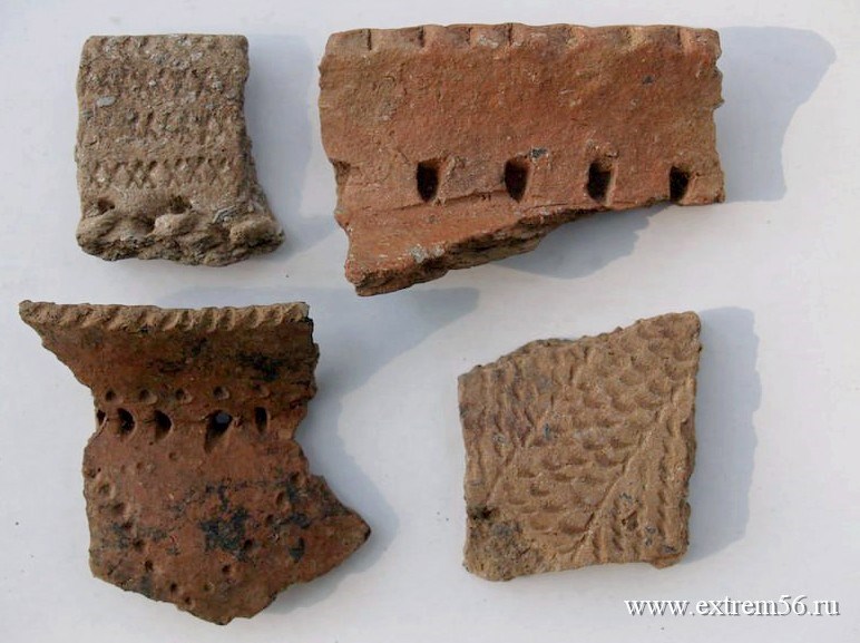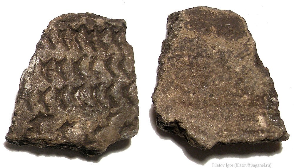 Кстати, о бронзе. На острове были обнаружены остатки, очень напоминающие печь для её производства… археологи просто уверены в этом – даже копоть на камнях сохранилась. Но главное – нашли шлак от металлургического производства. Остатки печи показали в одной передачке по телеку… очень хочется попросить археологов изучить их подробнее – возможно ещё до бронзы здесь работали и с медью. Тем более, что говорят, что на острове нашли медный нож и ещё медную пластину. Ну а пока исследователи говорят о временах Гамаюнской культуры Приуралья поздней бронзы и раннего железа. Есть подозрение, что они датировали второй этап исключительно по остаткам керамики, потому как других каких-то признаков не упоминается. А керамика, да – очень похожа внешне. Вот образец керамики Гамаюнской культуры из другого места: