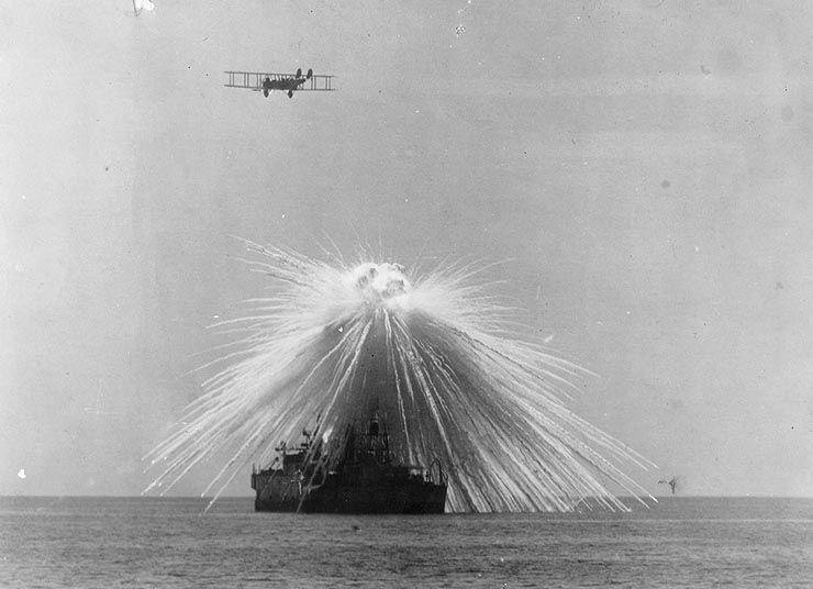 Автор: Андрей УлановБомба с белым фосфором взрывается на мачте USS Alabama. 23 сентября 1921 года. Опыты Митчелла...