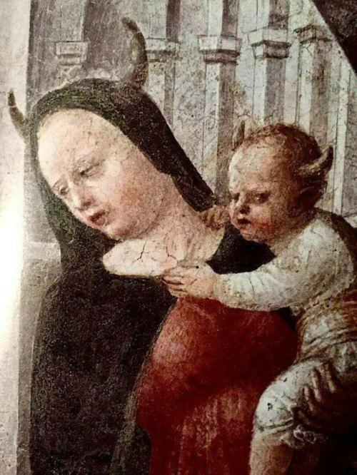 ️На стенах Капеллы Портинари в Италии находится удивительная картина - рогатой Богоматери с рогатым младенцем на руках. Какой-нибудь особо увлекшийся гид даже может поведать вам, что автор картины - сатанист, но чаще всего ее репродукцию и иллюстрации в Сети принимают за фейк. Однако, ни то, ни другое: там точно есть рога, а автор картины - Винченцо Фоппа - писал в рамках канона РКЦ эпохи Возрождения (фреска конца 15 в).