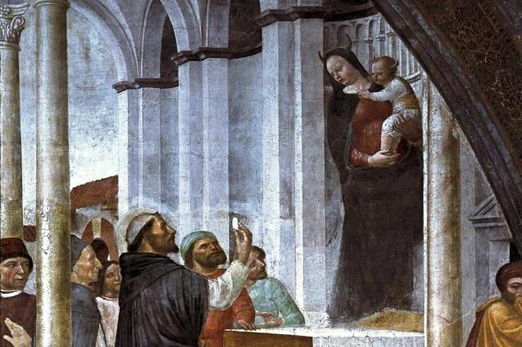 В Средневековье ходило поверье, что дьявол может принять чей угодно облик, даже Богоматери или Иисуса, но уродства своего спрятать не может... Поэтому по рогам-то его всюду и узнаешь! Автор фрески, таким образом, ярко визуализировал и сам рассказ о чуде, и поверье о дьяволе, не способном замаскиваться полностью.