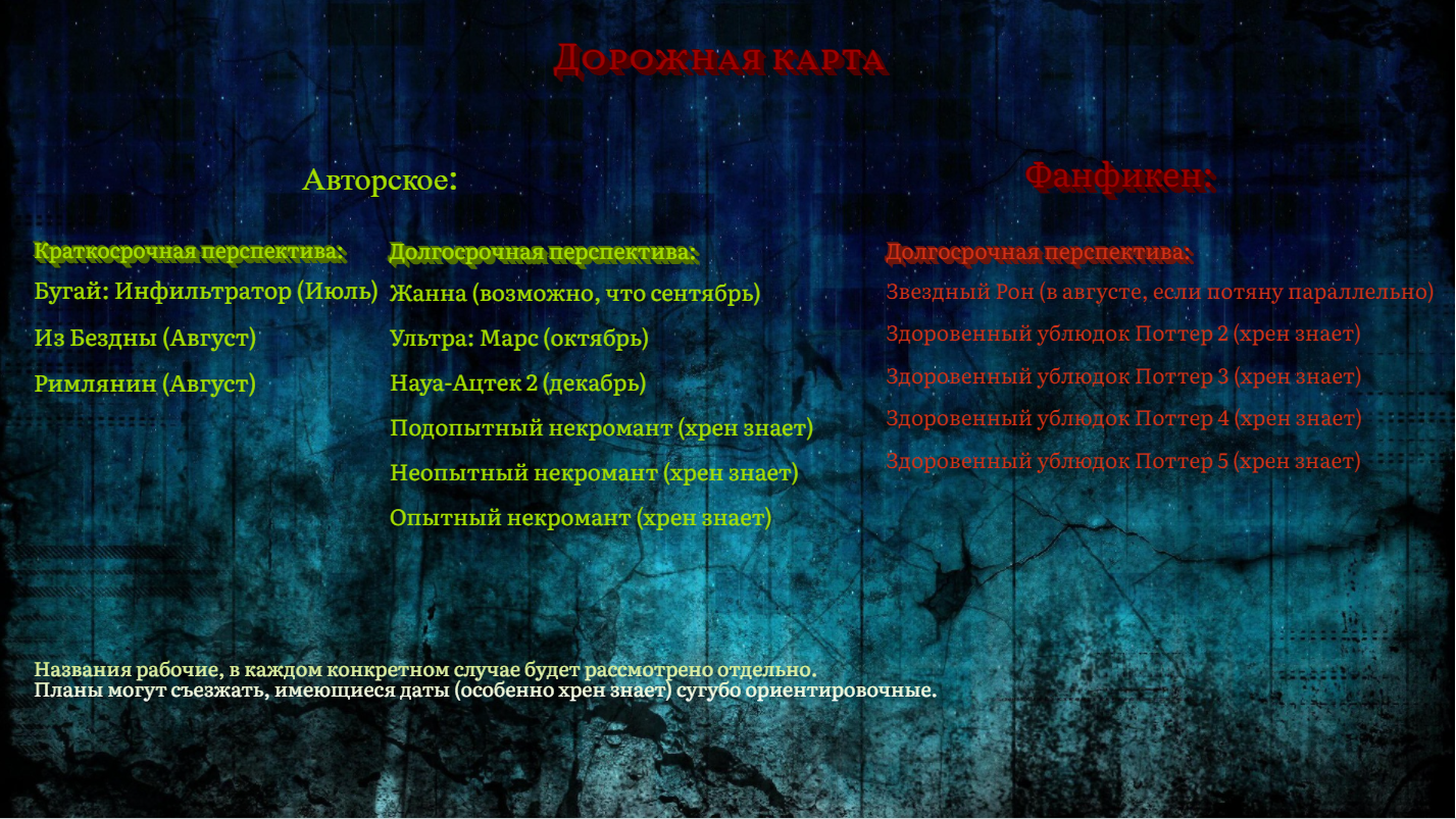 Представляю Вам своеобразную дорожную карту, которая одновременно служит анонсом предстоящих произведений (мини Е3, ёпт).