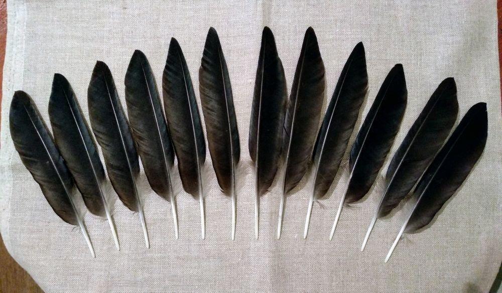 Был вариант с перьями совы, но они светлые и слишком мягкие, и мы решили использовать перья ворона. Большие, идеально черные, ровные перья, 12 штук. Как раз то, что нужно, они очень хорошо уравновешивали тяжелый и массивный верх ловца.