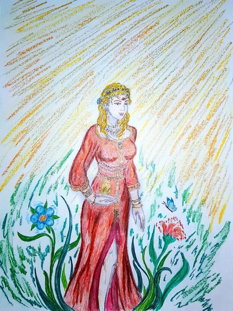 У Эрлессы несколько ипостасей. Первая – девочка в розовом платьице, босая, с короткими золотистыми локонами и венком из полевых цветов на голове . Вторая – молодая женщина с заплетёнными в сложную причёску волосами, одетая в алое платье из струящегося шёлка, расшитое драгоценными камнями, с десятком цепочек на шее и длинными бриллиантовыми серьгами в ушах. Третья же – пожилая седовласая леди в густо-багровом бархатном наряде, с рубиновым колье на шее и парой тяжёлых перстней на пальцах.