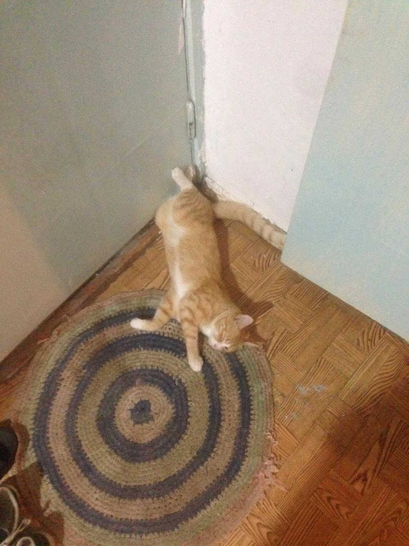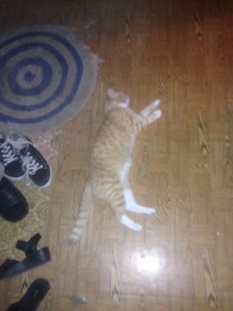 Со стороны похоже, что сдох. На самом же деле прикидывается шлангом. Стоит только сказать, идём жрать, как первым бежит к холодильнику.