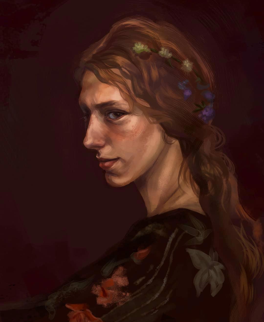 Портрет прекрасной девушки, найденной в том же альбоме. Чисто для тренировки на освещение и цвет. Тяга к стилю старинной живописи очевидна