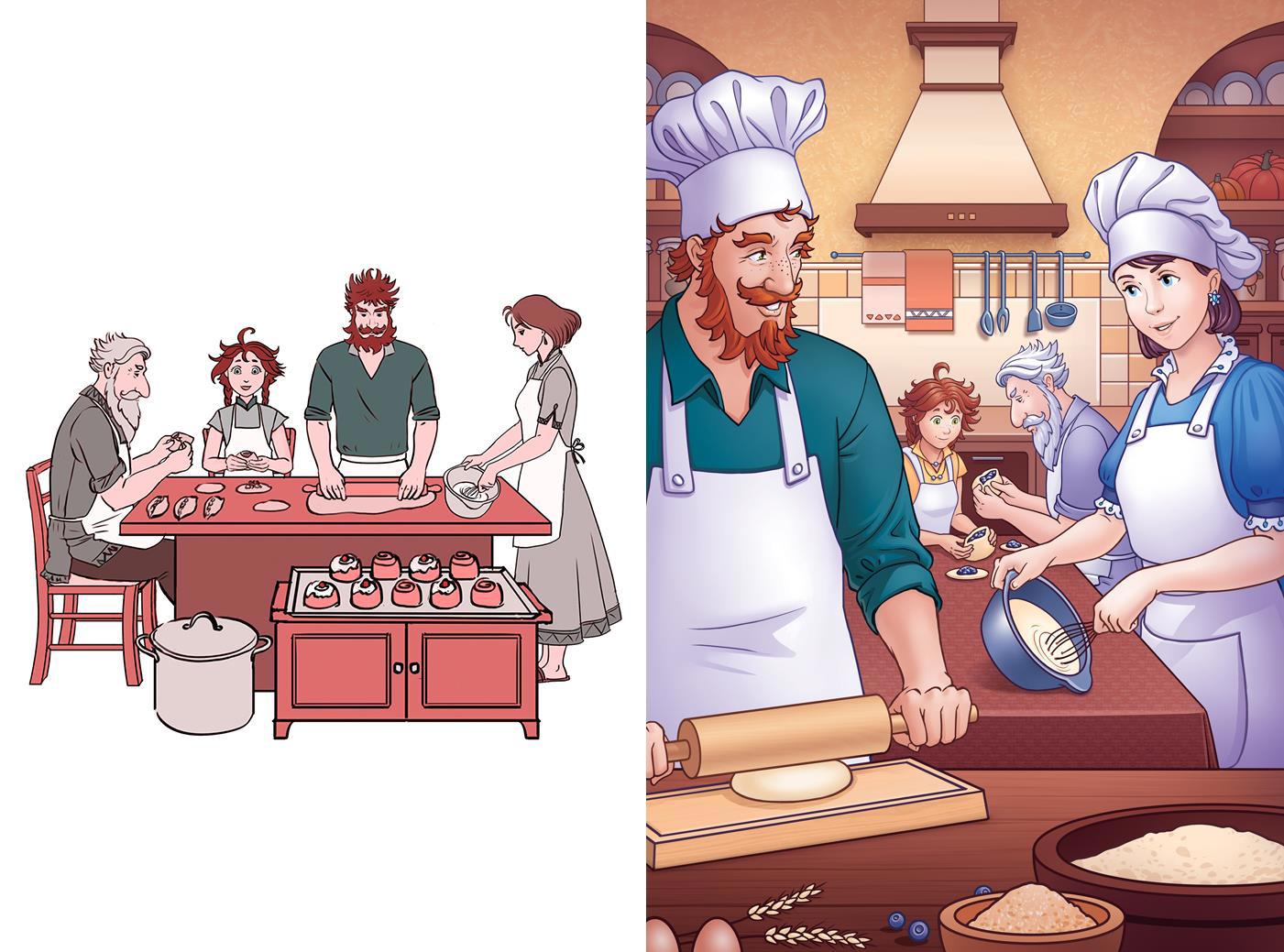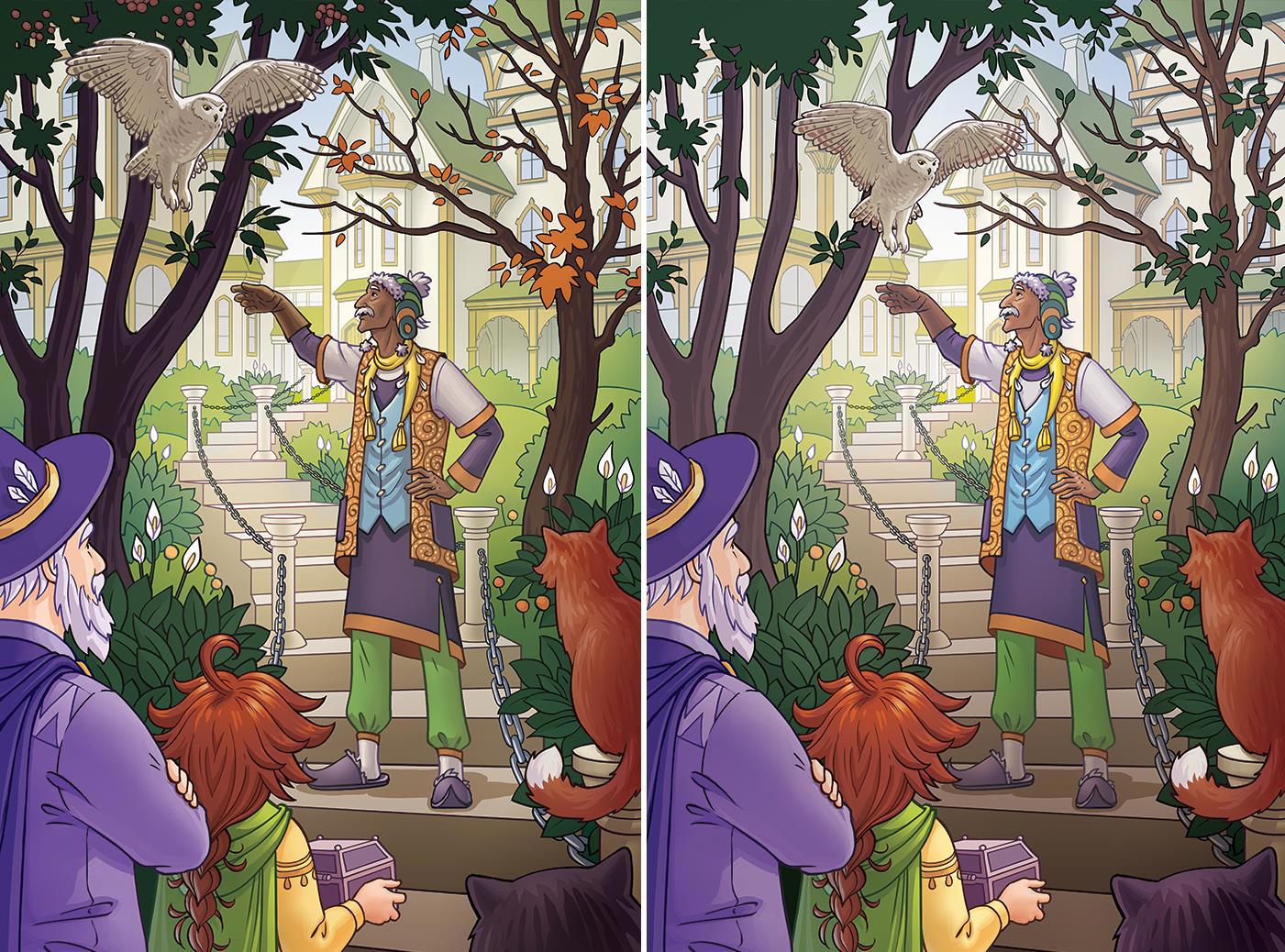 Иногда кажется: зачем перерисовывать? Проблему можно решить при помощи правок – но по факту эта пропасть ещё бездоннее. Сдвинуть персонажа на 2 мм влево, сделать синий цвет чуть более фиолетовым, осветить или затемнить отдельные участки, усилить воздушную перспективу, поменять позы и композицию, поправить сомасштабность, заменить один фон другим… – этим можно заниматься до бесконечности или пока не сойдёшь с ума. Кто пробовал, знает. Что же касается результата, то тут прекрасно работает принцип Парето: 80% усилий дают 20% результата. Или не дают. Потому что 80% правок никто не заметит – ни зрители, ни коллеги. Сомневаетесь? Тогда проверяйте. Слева исходник, справа переделка. Что изменилось? Ответы под спойлерами.
