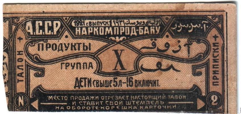 Для иллюстрации ниже - Отрезной купон детской продовольственной карточки, Баку, 1921 год: