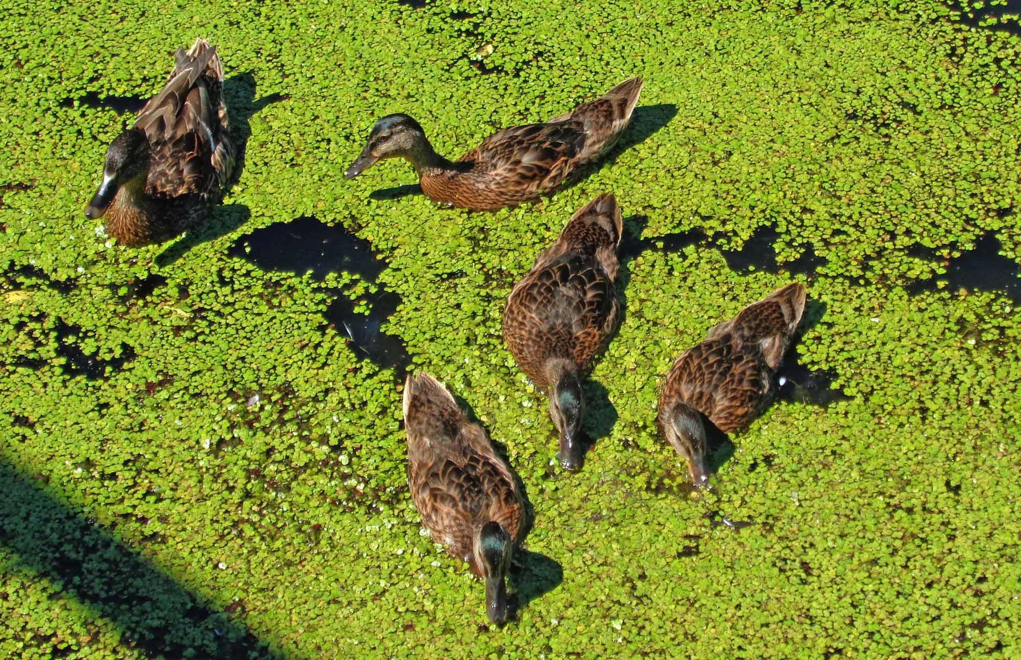 Обыкновенные дикие утки. Они тут живут всегда, даже зимой. Утка с выводком подросших утят: