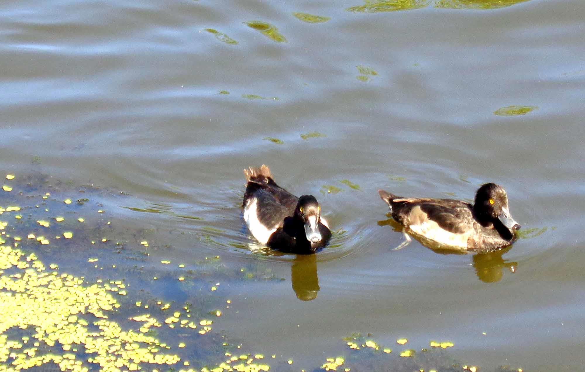 А это - нырок хохлатая чернеть. Деловая парочка, направлялась к мосту, в надежде, что остановившиеся там прохожие начнут кормить: