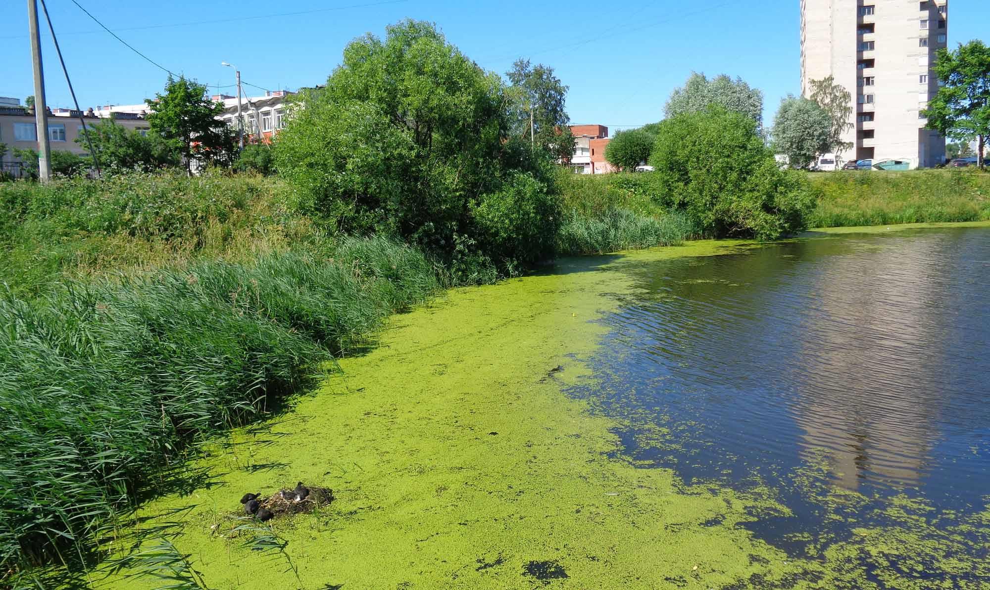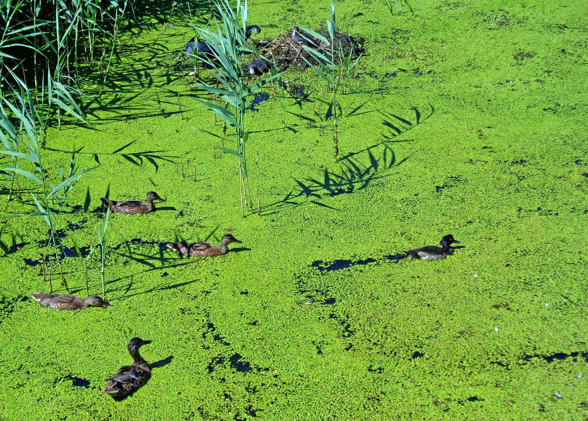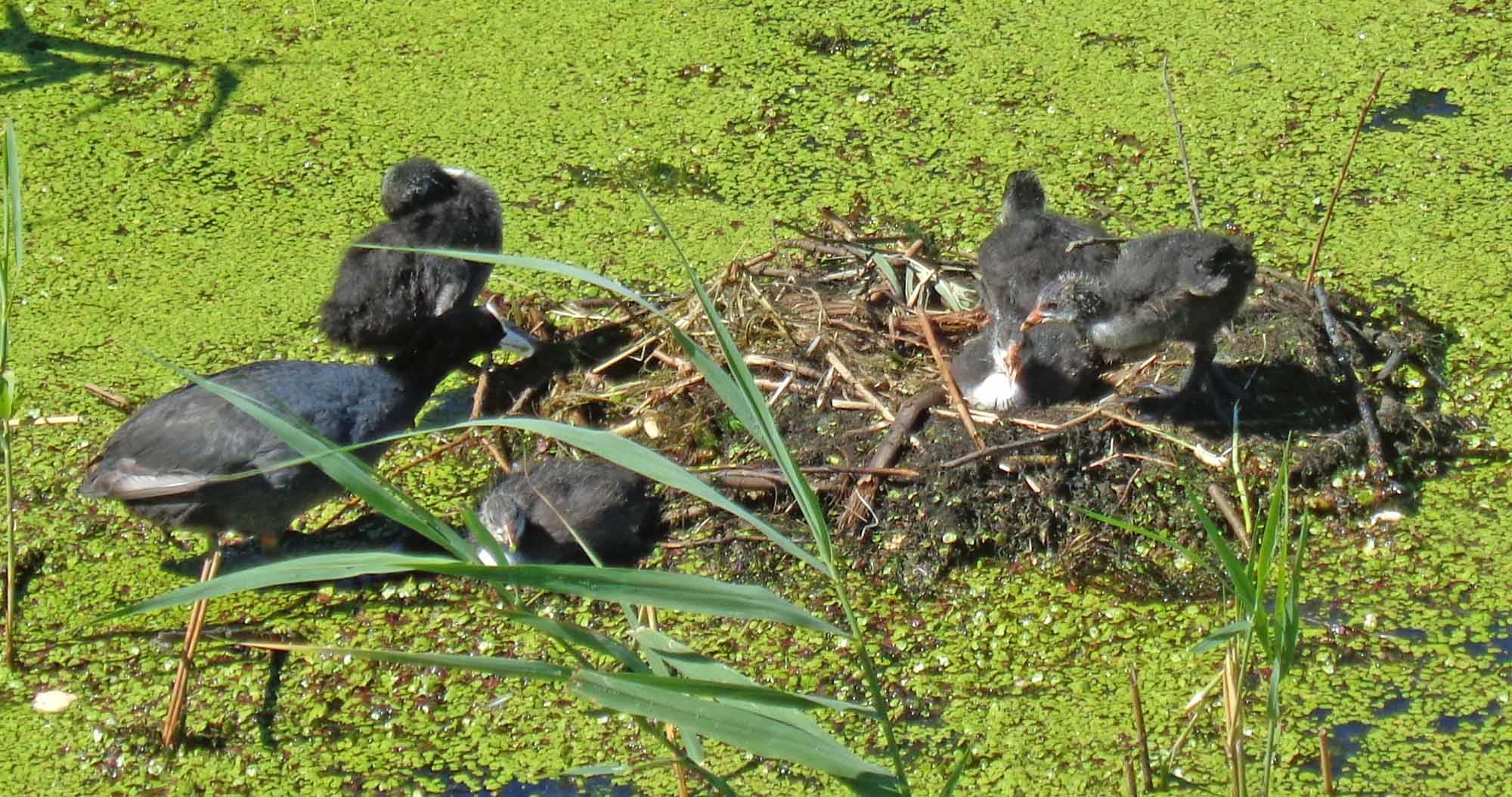 Зато уток - просто завались! Лысухи из семейства пастушковых. Организовали себе прямо на воде, среди ряски, гнездо. Выводок уже успел обрасти пухом и понемногу отращивает перья: