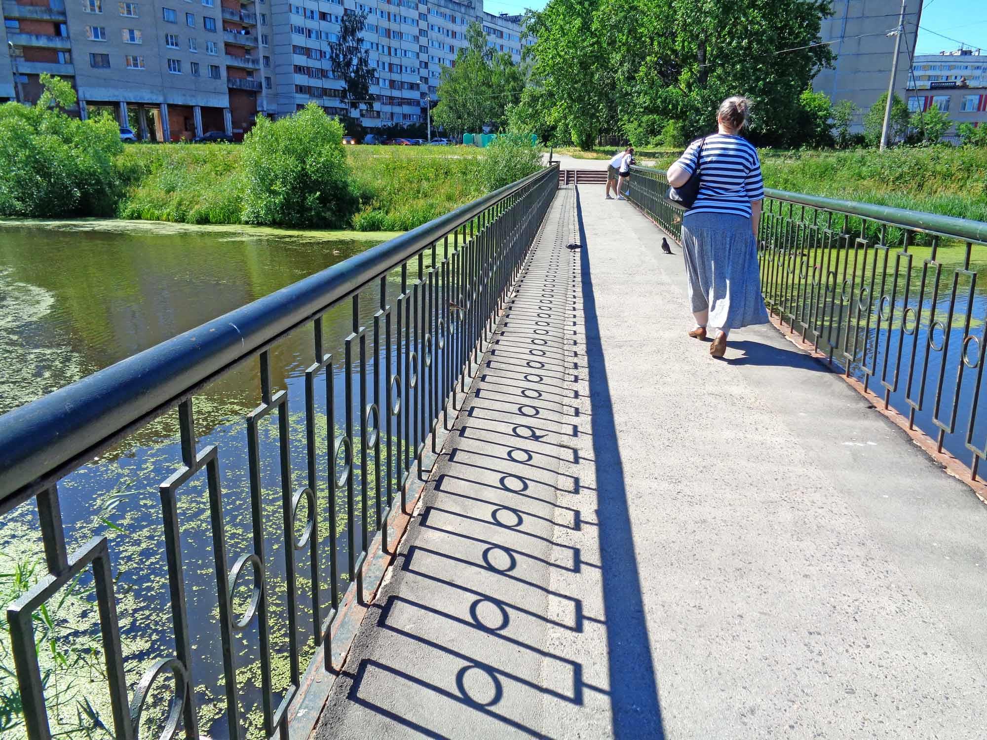 Мост через речку Ивановку, рядом с шлюзом. Здесь самое широкое место реки. Водится куча всякой водоплавающей братии, да и рыбы достаточно, она так и шныряет, подбирая хлеб, которым кормят уток. Рыбу сфотографировать не удаётся, вода мутная.