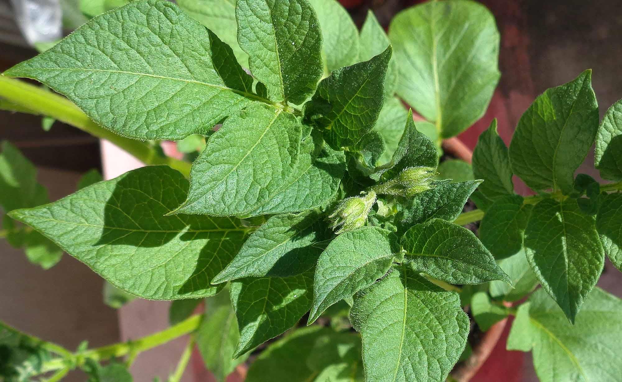 А это у меня на балконе картошка выпустила бутоны. Учитывая, что я её посадила месяца на полтора позже, чем следовало, она довольно быстро растёт и развивается))