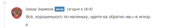 Автор: АлияПубликацию которого я посвящаю главному феминисту АТ, Захару Зарипову, который сегодня достал меня из своего игнор-листа, и туда же, после пары занимательных обсуждений (например про то, отличаются ли женщины по интеллекту от обезьян, где он, о чудо, признал свою неправоту) отправил. Он тут, в одном из диалогов, пообещал меня ещё и прямым текстом https://author.today/post/180783?c=9292121&th=9291393 кое-куда при этом послать, но яиц, ожидаемо, у него не хватило. Только вот на такое вот: https://author.today/post/180783?c=9294111&th=9293032.
