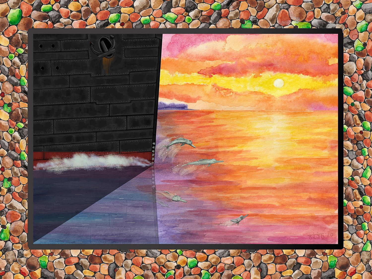 Дельфины сопровождают средний трансокеанский пароход «Янтарная грёза». Эти млекопитающие и здесь приспособились к антропогенному фактору и используют достижения человечества для собственных нужд. Судно создаёт волну, которая помогает животным экономить силы.