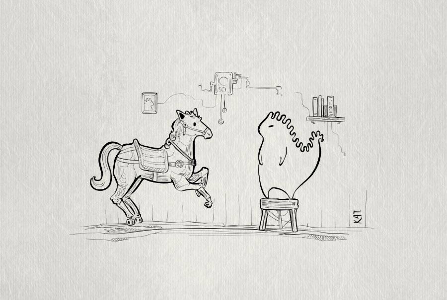 Аристарх взобрался на табуретку, чтобы показать самой удивлённой в мире карусельной лошадке, кто в этом доме хозяин (тут целая история: сначала он её где-то украл одной особенно залихватской ночью после третьего стакана улиточного бальзама, утром устыдился, пытался вернуть в три разных места — нигде не взяли, а теперь вот: смотрит)