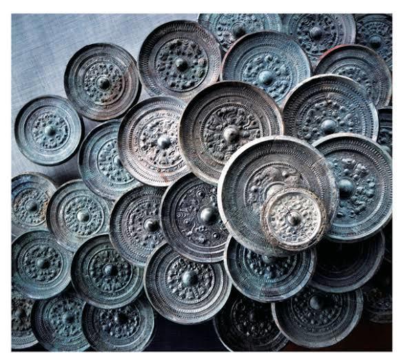 Среди найденного оружия, доспехов, наконечников для стрел и даже утюгов, главным были 34 китайских зеркала-докё. Они по периметру окружали истлевший гроб, который покоился на алом ложе из глины. По японским поверьям, красный (и его оттенки, включая оранжевый) цвет отпугивает злые силы. Видимо, зеркала, которыми был обложен гроб, служили той же цели.