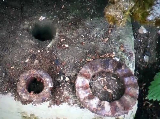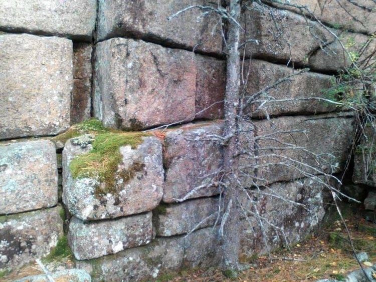 А ещё имеется информация о том, что в камнях-то этих, точнее в этих здоровенных блоках, имеются сквозные отверстия. Даже фотки показывают и добавляют, что через отверстия эти пропущены металлические стержни, на которых вся эта кладка до сих пор спокойно стоит и не шатается. Даже вот такую фотку показывают...