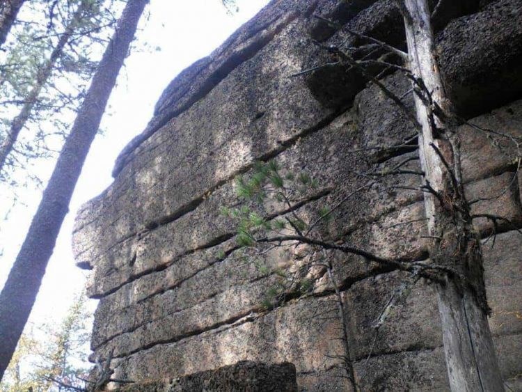 И в данном случае не имеет никакого значения, расплавленное ли вещество после извержения вулкана здесь застыло и растрескалось, или это какая-то смесь песка с глиной высохла и растрескалась – картинка будет в обоих случаях весьма схожей. Как хотите, ребята, но на каменную кладку это совсем не похоже. Это именно трещины. И я поэтому готов поверить, что и вот на этой фотографии, сделанной в Койском Белогорье, мы видим «шутку природы», хотя и весьма странную. В том смысле, что остатки такой высокой стены рядом отсутствуют. А ведь отколовшиеся куски не могли сами никуда уйти. Так где же они? Может вы видите?